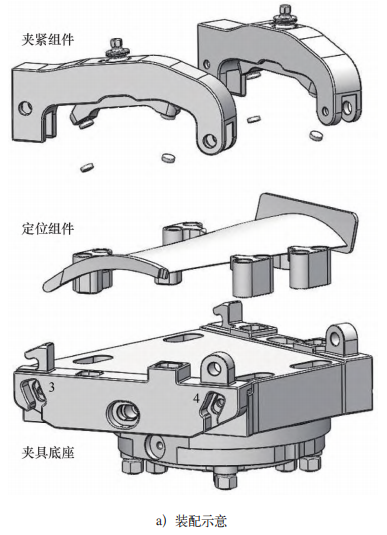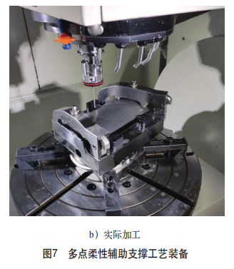 目(mù)前在工藝裝備設(shè)計過程中,普遍使用有(yǒu)限元分析、遺傳算法等手段來優化多點輔助支撐的布局(jú)[35],但是優化的(de)結果通(tōng)常隻能保證在一點上的加工變形量達(dá)到最小(xiǎo),而並不能保證在其(qí)他加工部位也能起到同等的抑製變形效果。在葉(yè)片加工過程中,通(tōng)常在同一(yī)機床上對工件進行一係列的走刀加工,但加工不同部位(wèi)的裝夾需求是不同的,甚至可能是時變的。對於靜(jìng)態(tài)多點支撐方法,如果通過增加輔助支撐(chēng)的數量來(lái)提高工藝係統剛度,一方麵會(huì)增大工裝的質量和體積,另一方麵也壓(yā)縮了(le)刀具(jù)的運動空間。而(ér)如果在加工不同部位時(shí)重新設置輔助(zhù)支(zhī)撐的位置,則必然會中斷加工過程,降低加工效(xiào)率。因此,根據加工過程自動在線調節支(zhī)撐布局和支撐力的隨動工藝(yì)裝(zhuāng)備[36-38]被提(tí)出。隨動工(gōng)藝裝備(見(jiàn)圖8)能夠在任一加工工序開始前(qián),基於時變切削過程的刀具軌跡與工況轉變,通過(guò)刀具與工裝的協同配合實現動態(tài)支撐:先將輔助支撐移動到有助於抑製當前加工變(biàn)形的位置,使工件的加工區域受(shòu)到積極支撐,而工件其(qí)他部位在盡可能少(shǎo)的接觸(chù)下保持定位不變,從而匹配加(jiā)工過程中時變的(de)裝夾需求。