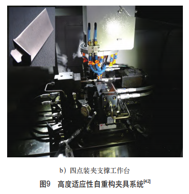 目前,國內外學者均在自重構群夾具方麵進行了一些研究與嚐試。國外方麵,歐盟(méng)項目SwarmItFIX開發了一種新的高度適應性自重構夾具係統[41],該係(xì)統使用一組移動輔助支撐在工作台上自由移動並實時重新定位,以更好地支撐加工零件。SwarmItFIX係統的原型已在該項目中實現(見圖9a),並在一(yī)家意大利飛機製造商的場地上進行(háng)了測試。國內則是有清華大學(xué)王輝團隊製作了一種可與機床協同控製的四點(diǎn)裝夾支撐工作台(tái)[42](見圖9b),可以在(zài)渦輪葉片榫根的精加工過程中對處於懸臂狀(zhuàng)態的榫根進行支撐以及自動刀具避讓。在加工過程中,四點輔助支撐與數控加(jiā)工中心協同配合,根據刀具運動位置重構四點(diǎn)接觸狀態,既避免了刀具與輔助(zhù)支撐相互幹涉,又保證了支撐效果。