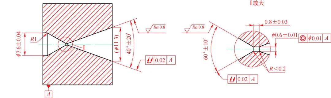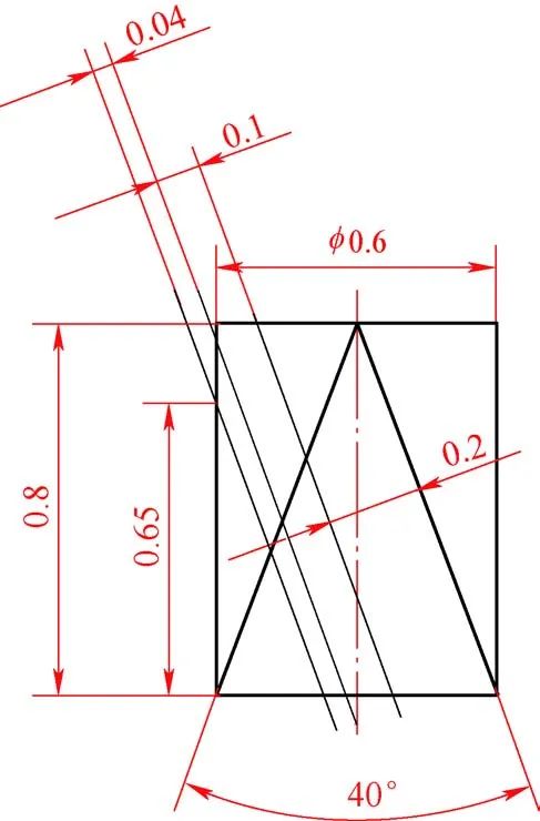 3)線切(qiē)割雙內錐(zhuī)孔與微小孔時易產生相互幹涉。線切割加工40°±20′錐孔後,φ(0.6±0.01)mm微小孔長度(dù)(0.8±0.03)mm易產生(shēng)過切(qiē)(見圖3),長度(dù)超差。加工40°錐角時,主切偏移量為0.1mm,再加上0.04mm放電間隙,當電極絲傾斜20°時(shí),影響φ0.6mm微小孔(kǒng)60°方向孔口到60°端麵距離。