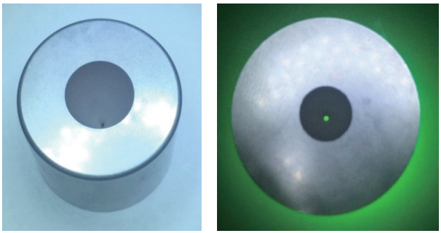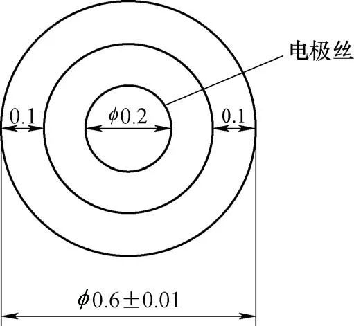 2)高精度內孔與外圓的同軸度要求高。陽極兩端雙(shuāng)內錐孔和中間微小孔需要與外圓保證同軸度φ0.01mm以內(nèi),結構之間才能較好過渡,從(cóng)而避免出現結構錯位。為保證後續線切割能加工內孔成形,穿絲孔(kǒng)需要單邊留餘量≥0.1mm,φ0.2mm電極絲與放電間隙之和需要≥0.25mm,避免慢走絲加工時,因電極絲裝夾偏離穿絲孔中心較大而造成短路。φ(0.6±0.01)mm內(nèi)孔(kǒng)的穿絲孔孔徑最大可達φ0.4mm。線切(qiē)割絲徑與內(nèi)孔如圖2所示。穿絲孔為深徑比達57的深(shēn)小孔,並要求與外圓(yuán)的同軸度<φ0.10mm,可避免φ(0.6±0.01)mm內孔加工後留下穿絲(sī)孔痕跡。