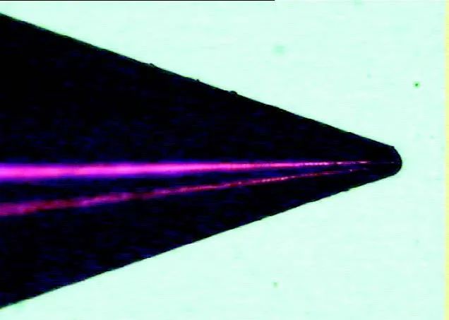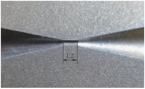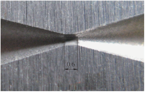 針(zhēn)對慢走絲線切(qiē)割錐麵時φ (0.6±0.01)mm內孔幹涉問題,采取加工時φ 0.6mm兩端孔口到(dào)端(duān)麵距離分別留(liú)餘量0.2mm的措施。此時錐角需加工至24°。然後其餘錐孔尺寸和內孔長度轉至電火花成形加工。線切割後中心微小(xiǎo)孔形貌如圖5所示。