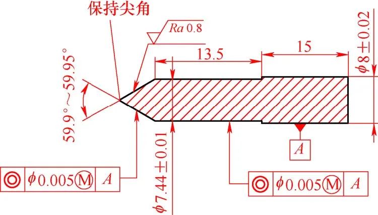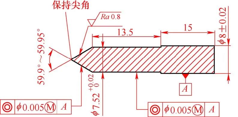 陽極材料為WRe25鎢錸合金,外圓和端麵(miàn)對幾何公差要求較高,內部結構加工要(yào)求也較嚴格,內錐孔錐角40°±20′和60°± 10′、φ(0.6±0.01)mm微小孔與外(wài)圓(yuán)同軸度φ0.01mm以內(nèi),φ(0.6±0.01)mm微(wēi)小孔長度(0.8±0.03)mm,錐孔角度公差(chà)最嚴要求(qiú)為±10′,表麵質量達到(dào)表麵粗糙度值(zhí)Ra<0.8μm。陽極如圖1所示(shì)。