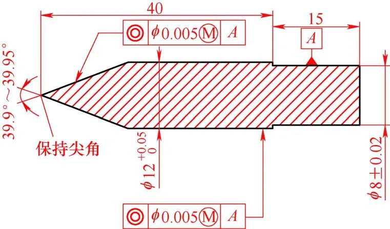 4 )雙內錐孔精度和表麵(miàn)質量要求高。40°±20′和60°±10′錐角(jiǎo)尺寸(cùn)精(jīng)度(dù)要求較高,並且全跳(tiào)動值(zhí)在0.02mm以內,表麵粗糙度值Ra<0.8μm,對電加工工藝參數(shù)及電(diàn)極製作都(dōu)提出了較高要求。