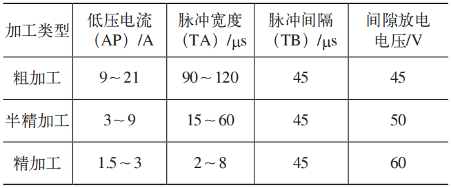 加工過程(chéng)中粗加工需要大能量去除餘量,然後(hòu)精加工(gōng)深度達到尺寸公差要求,修光表麵達到工(gōng)藝要求。加工過程中的參數(shù),隨著零件(jiàn)表麵餘(yú)量的減少,低壓電流和脈寬逐漸減小(xiǎo),間隙放電電(diàn)壓逐(zhú)漸變大。電加工參數見表1。