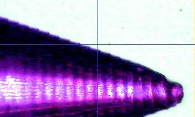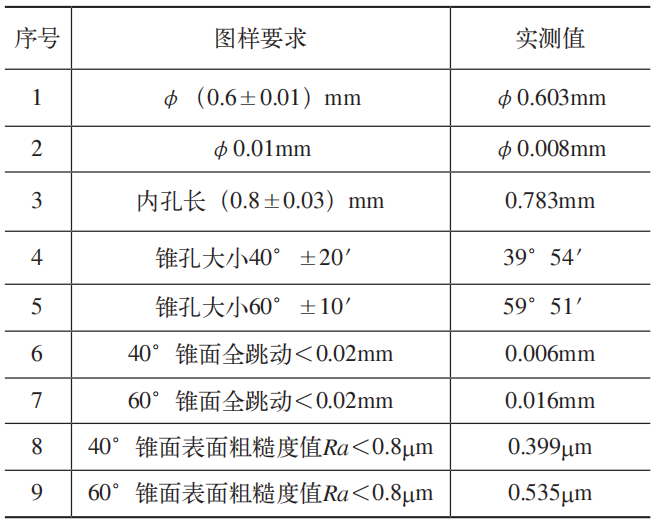 加工後的陽極經過微小孔、雙錐孔及表麵質量檢(jiǎn)測,全部滿足圖樣要求,微小孔實測值為φ0.603mm,與外圓同軸(zhóu)度為φ0.008mm,錐麵全跳動最優(yōu)可達(dá)0.006mm。陽極檢(jiǎn)測值見表2,陽極外觀如(rú)圖(tú)10所示。