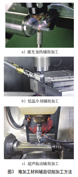 低溫冷卻輔助加工[10](見圖3b)則是使用液(yè)氮、高壓二氧化碳氣體等冷卻介質噴塗到切削部(bù)位,對切削加工過程進行冷卻,避免因為材料導熱性能差引起的局部(bù)切削溫度(dù)過高問題,還使得工件局部冷脆,增(zēng)強斷屑(xiè)效果。英國的Nuclear AMRC公司成功使(shǐ)用高壓二氧化碳氣體對(duì)鈦合(hé)金的加(jiā)工過程進行冷卻,與幹切削狀態對比分析表明,低溫冷卻輔助加工不僅能夠降低切(qiē)削力,提高切削加工表麵的質量,還能有效減小(xiǎo)刀具磨損,增長刀具的使用壽命。此外,超聲振動輔(fǔ)助加工[11,12](見圖3c)也是難加工材料高效切削加工的(de)有效(xiào)方法。通過在刀具(jù)上施加高頻、微小幅度的振動,實現加工過程中刀具與工件之間發生間斷性分離,改(gǎi)變了(le)材(cái)料去除(chú)機理,增強了(le)動態切削的穩定性,有效避免刀具與已加工表麵間(jiān)的摩擦,降低切(qiē)削溫(wēn)度和切削力,降低表麵粗糙度值,減小刀具磨損,其優良的工藝效果已經得到廣泛的關注。
