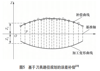基於上述的預測模型或(huò)在機(jī)測(cè)量技術,人們(men)能夠對(duì)加工參數進行優化甚至是實時調控。主流(liú)的(de)方(fāng)向是通過刀具路徑的重新(xīn)規(guī)劃來對變形和(hé)振動造成的誤差進行補償。這一(yī)方向(xiàng)常(cháng)用(yòng)的方法(fǎ)是“鏡像補償(cháng)法”[20](見圖5),該方法通過對名義刀具軌跡(jì)進行修正(zhèng),補償(cháng)單次切削的變(biàn)形量。但是單次補償會產生(shēng)新的加工變形,因此需要通(tōng)過多次補償在切削力(lì)和加工變形之間建立迭代關係,逐次修正變形量。除(chú)了基於刀(dāo)具路徑規(guī)劃進行主動誤差補償的方法之外,許多學者也在研究通過優化調控切削參數、刀具參(cān)數等方式來控製變形和振動。對於某型號航空發(fā)動機(jī)葉片的切削加工,改變(biàn)加工參數進行多輪正交試(shì)驗,基於試驗數據分(fèn)析各切削參數、刀具(jù)參數對葉片加工變形、振動響應(yīng)的影響規律[21-23],建(jiàn)立經驗(yàn)預測模型,從而(ér)優選加工參數(shù),有效減(jiǎn)小