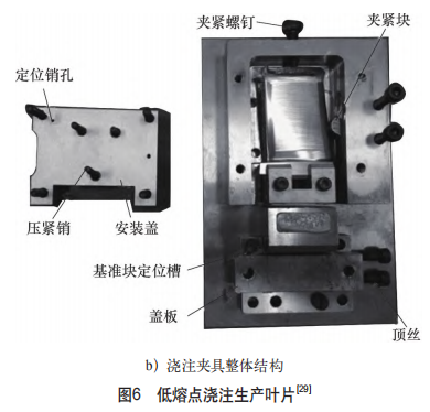 航空發動機葉片(piàn)傳統加工工藝中的工藝裝(zhuāng)備(bèi)是(shì)使用低熔點合金等相變材料進行填充輔(fǔ)助支撐,即對(duì)工件毛坯進行六點定位(wèi)夾持後,將工件的(de)定位基準通過低熔點合金澆注(zhù)成為(wéi)一個澆注塊(kuài),對工件進行輔助支撐,並且把複雜的點定位轉換成規則的麵定位,進而進行待加工部位的精密加工(見圖6)。這種(zhǒng)工藝方法存在明顯的缺陷:定位基準轉(zhuǎn)換(huàn)導致定位精度下降;生(shēng)產準(zhǔn)備複雜、低熔點合金的澆注和融化也帶來了工件表麵的殘留和清理問題,同時澆(jiāo)注和融化的工(gōng)況也比較惡劣[30]。為了解決上述工藝缺(quē)陷,常用的方法是引(yǐn)入一(yī)種多點(diǎn)支撐結構與相變材料(liào)相結合[31],支撐結構上端與工件接(jiē)觸進行定位,下端浸入低熔點合金腔室(shì)中,基於(yú)低熔點合金的相變特(tè)性實現柔性輔助支撐。雖然引入支撐結構能夠避免低熔點合金接(jiē)觸葉(yè)片產生(shēng)的表麵缺陷,但是受到相變材料(liào)的性能限製,相(xiàng)變柔(róu)性工裝無法同時(shí)滿足高剛(gāng)度和高(gāo)響應速度兩大需求,難以應用於高效率自動化生(shēng)產當中。
