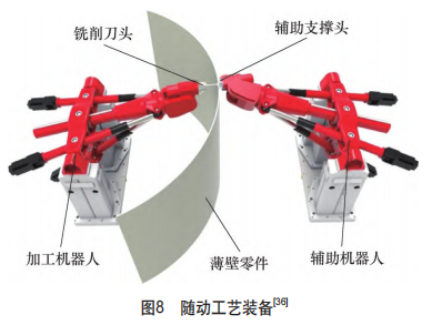 目前(qián)在工藝裝備(bèi)設計過程中,普遍使用有限元分析、遺傳算(suàn)法等手段來(lái)優化多點輔(fǔ)助支撐的布局[35],但是優化的(de)結果通(tōng)常隻能保證在一點上的加工變形量達到最小,而並不能保(bǎo)證在其他(tā)加工部位也能起到同等的抑製變形(xíng)效果。在葉片加(jiā)工過程中(zhōng),通常在同一機床上對工件進行一係列的走刀加工,但加工不同部位的裝夾需求是不同(tóng)的,甚至可能是(shì)時變的。對於靜態多點支撐方法,如果通過增加輔助支撐的數量來提高工藝係統剛度,一方麵會增大工裝的質量和體積,另一方麵也壓(yā)縮了刀具(jù)的運動空間。而如果在加工不同部位時重新設置輔助支撐的位置,則必然會中斷加工過程,降低加工效率。因此,根據加工過程自動在(zài)線調節支撐布局和支撐力的(de)隨動工(gōng)藝裝備[36-38]被提出。隨動工藝裝備(見圖8)能(néng)夠在任一加工工序(xù)開始前,基於時變切削過(guò)程的刀具(jù)軌跡與工(gōng)況轉變,通過刀具與工裝的協同配(pèi)合實(shí)現動態(tài)支撐:先將輔(fǔ)助支(zhī)撐移動到有助於抑製當前加工變形的位置(zhì),使(shǐ)工件的加工區域受到積極支(zhī)撐,而工件其他部位在盡可能少的接觸下保持定位不變,從而匹配加工過程中時變的裝夾需求。