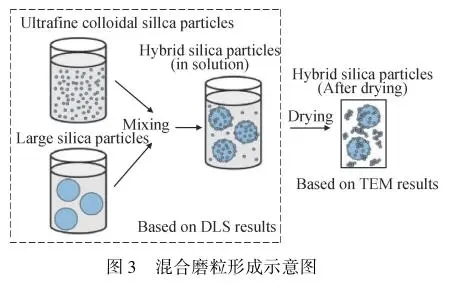 除了上述不同材質磨粒之間的混合,還存在相(xiàng)同材質不同粒徑磨粒之間的混合(hé)。Lee等(děng)將粒徑(jìng)為30nm和70nm的SiO2磨粒(lì)按比例進行混合(hé),隨著(zhe)兩種磨粒濃度比的改變,工件表麵材(cái)料的去(qù)除方式也發生(shēng)兩體和三體磨粒去除的改變,當兩種磨粒質量比為2∶1時,材(cái)料去除方式(shì)為兩體磨粒去除(chú),材料的去除率最高。Bun-Athuek等(děng)將粒徑為4nm的SiO2分別(bié)與20nm、55nm、105nm的SiO2磨粒混合,混合磨粒的形成示意圖分別如圖3所示,發現超(chāo)細磨粒吸附在大粒徑磨粒外圍,改變了(le)大粒(lì)徑磨粒的形貌特征,提升了研拋效(xiào)率(lǜ)。Lee等(děng)將粒徑為30nm的球(qiú)形磨粒和70nm的非球形磨粒進行混合,相比球形SiO2磨粒,混合磨粒可顯著提升(shēng)研(yán)拋效率(lǜ);此外,提升球形磨粒在混合磨粒中的比例,可以改善非球(qiú)形磨粒的切削能力,提(tí)升(shēng)研拋質量。