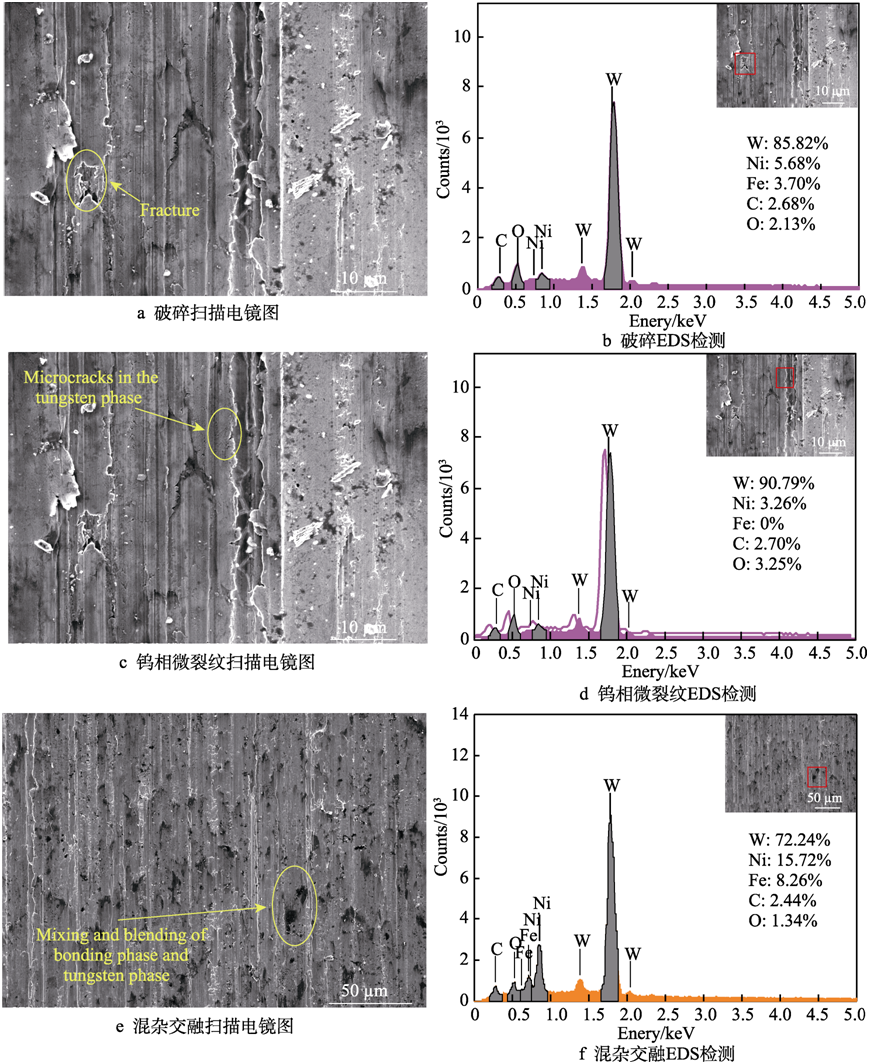 3)在鎢(wū)合金不同相位的材料去除(chú)特征也不同。在鎢相,既有(yǒu)脆性特征,也有塑性特征。在黏結(jié)相,刻劃深度較淺時主要呈現塑性變形、塑性流動等特征,刻劃深度較大時主要呈現與鎢相的混雜和交融,且混雜交融區未(wèi)出現材料卷起,說明混雜交融區(qū)有(yǒu)利(lì)於改善(shàn)表(biǎo)麵質(zhì)量。在相界處會阻斷去除特征的傳遞,使得相鄰鎢顆粒呈現出不同的損傷或者去除(chú)特征。