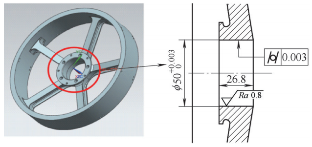 動量(liàng)輪利用陀螺(luó)定軸性和(hé)轉(zhuǎn)速變化而產(chǎn)生的反作(zuò)用力矩(jǔ),來穩定或改變衛星的姿態。動量輪產品的加工精度直接影響(xiǎng)整個(gè)航天(tiān)器的運行壽命、控製精度和可靠性,而輪體內孔的加工質量則決定了(le)動量輪(lún)的(de)整體裝配精度。該部位的形狀及尺寸精度要求極為嚴格,在(zài)實際生產中,由於內孔(kǒng)采用常規車削和磨削無法保證尺寸和(hé)形狀公差,因此輪體內孔精密加工成為動量輪製造瓶頸。
