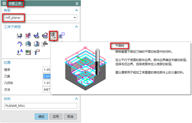 在加工界麵中,【創(chuàng)建工序】-【mill_planar】-【平麵銑】,如下圖所示: